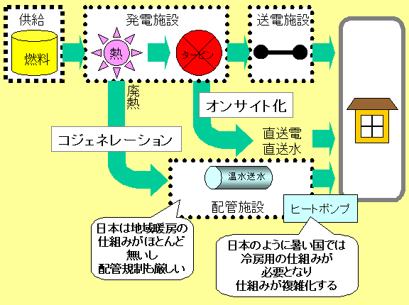 コジェネレーションは古くから将来有望と言われ続けていきた。ところが、日本では普及が進まない。都市再開発の進展に伴って、これから展望が開けるという楽観的な見方もあるが、その歩みはのろく、とても期待できそうにない。もともと、厳格な配管規制がある上、地域の配管設備構築費用が膨大なので、コジェネ設置のメリットが限定的なのだ。政治状況を考えれば、この状況が急激に変わるとは思えまい。 しかし、遅かれ早かれ、コジェネが基本となると考えるべきだ。燃料から熱だけを取り出すという、無駄なエネルギー消費の仕組みを是正する動きは、必ず進む。 熱が必要なら、まずはエンジンやガスタービンが回り、その廃熱を活用する仕組みが取り入れられる。地域供給型のコジェネの普及が進まないのなら、末端からコジェネが普及していくだろう。 ![]() といっても、末端に注目が集まっているとは言い難い。ボイラー統計は設置容量だけしかわからず、稼働状況がわからないから、ビルのコジェネ市場は不透明なままだ。コジェネを進めたい人は少数派に留まっているのだ。 しかし、技術が進展すれば、イノベーターが登場し、こうした沈滞ムードは一気に吹き飛ばされるだろう。 すでに、その兆候はある。 99年、自動車メーカーが家庭用コジェネ機器の商用プロトタイプを提示した。0.5m角で高さ1mの温水・発電機である。発表によれば、エネルギー効率は8割。コストの壁さえ越えれば、革命的なエネルギー効率が実現できることになる。 高度なエンジン開発能力を持つ企業のこうした動きが「エネルギー革命」を牽引していくことになろう。 エネルギーの将来の目次へ>>> トップ頁へ>>> |