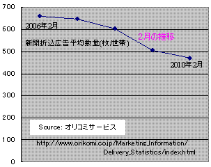 (1) パソコンやテレビでニュースを見る程度で十分と考える層は増大していそう。しかし、新聞が邪魔な訳ではないから、家族に一人でもじっくり読む人がいれば、宅配購読は続けるということ。(2) 新聞は読まないが、宅配してもらわないとこまるという家庭も多そう。テレビ番組案内が、チャンネルリモコンのところにないと面倒というのが最大の理由かも。それに、新聞そのものではないが、折込チラシの情報は貴重な筈。 特に重要なのが、チラシの存在。これは新聞の宅配ビジネスモデルを支えるものでもある。広告の対費用効果を厳密に考えるようになってきたため、次第に枚数は減ってきたようだが、月に、一世帯で500枚近いのだから、1枚の配布料金を4円とすれば、2,000円近い収入が業界に落ちていることになる。