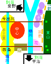 冒頭の地図で示したが、さらに鴨川をわたり都側に入れば、そこは商業区域。さらに堀川まで行けば、染物業者が集まってくる訳で、堀川の上流は織物業の西陣となる。